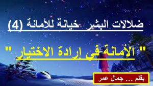 وتبعا لتزوير مفاهيم الدين والعبادات تم تزوير مفهوم الأمانة التي يذكرها الله بقوله تعالى .. {إِنَّا عَرَضْنَا الْأَمَانَةَ عَلَى السَّمَاوَاتِ وَالْأَرْضِ وَالْجِبَالِ فَأَبَيْنَ أَن يَحْمِلْنَهَا وَأَشْفَقْنَ مِنْهَا وَحَمَلَهَا الْإِنسَانُ إِنَّهُ كَانَ ظَلُوماً جَهُولاً }الأحزاب72 ، والتي فسرها كثير من المفسرون بأنه الصلوات والبعض قال أنها العقل ، وغفل الجميع أن الأمانة وصفها الله بما أشفقت منها فئة الخدمة من خلق الله (السماوات والأرض والجبال) ، وهي نفسها الفئة التي أختارت أن تؤدي مهمة العبودية التي خلقها الله من أجلها طواعية دون أن يكون لها إرادة أن تفعل أو لا تفعل لقوله تعالى .. {ثُمَّ اسْتَوَى إِلَى السَّمَاء وَهِيَ دُخَانٌ فَقَالَ لَهَا وَلِلْأَرْضِ اِئْتِيَا طَوْعاً أَوْ كَرْهاً قَالَتَا أَتَيْنَا طَائِعِينَ }فصلت11 ، وهنا يظهر الفارق فهذه الفئة اختارت أن لا يكون لها إرادة الفعل ، وهو ما اختار الإنسان عكسها بأن يكون صاحب (إرادة) قدرة على الاختيار ، فتحمل بذلك "أمانة الاختيار" ، وهو جهل منه بقدراته وظلم منه لنفسه ، وبالتالي تصبح الأمانة التي تحملها الإنسان هي "أمانة الاختيار" في أن يؤدي مهمة العبودية (العبادات) والتي هي إعمار الأرض كخلفاء لله عليها "بإرادتهم ونواياهم الحرة" وفي حدود ما يأمرهم به ربهم وينهاهم عنه وذلك بالعلم والعمل والكد والكدح لإعمار الدنيا لقوله تعالى .. {يَا أَيُّهَا الْإِنسَانُ إِنَّكَ كَادِحٌ إِلَى رَبِّكَ كَدْحاً فَمُلَاقِيهِ }الانشقاق6، وهي التي يحاسبهم الله عليها كمهمة عبودية مكلفين بها كخلفاء لله على الأرض .