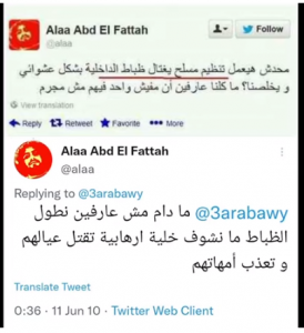 ولمن لا يعرف .. فعلاء عبد الفتاح هو أحد نشطاء الليبراليين والمنتمي لجماعة 6 إبريل ، وتلقى تدريبه الكامل في صربيا ، بل وحاصل على دبلومة في أساليب صناعة الثورات وتفكيك الدول من الداخل ، وعلاقته بالمخابرات البريطانية بدأت بانضمامه لمؤسسة “فريدم هاوس” التي يمولها ملياردير يهودي وتديرها المخابرات البريطانية منذ أكثر من عشرين سنة ، وكان أحد المحتفل بتخرجهم في مقر الشبابت الإسرائيلي وبفيديوهات وصور موثقة ، وهو لم ينكر هذا بل ويتفاخر به ، فهو خائن محترف وكاره لمصر والمصريين ، ولذلك فهو سجين محترف ، وسبق إطلاق سراحه أكثر من مرة ، وفي كل مرة يتلقى فيها تمويلا من “فريدم هاوس” يزداد نشاطه حتى يتم القبض عليه ومحاكمته ، وكذلك هو عميل للمخابرات البريطانية بالوراثة عن أسرته ، لدرجة أن بريطانيا منحت والدته وأخته الجنسية ، ثم منحته هو أيضا الجنسية صوريا وهو مسجون ، لتكون حجة لإطلاق سراحه ، فهو عميل مهم ونشط ويمكن تحويله لأيقونة للثورة الجديدة في مصر ، ولذلك لا عجب أن يغرد السفير البريطاني الأسبق قائلا أن علاء عبد الفتاح جوهرة لابد أن لا يخسرها المصريون والبريطانيون ، تلك الجوهرة التي غردت قائلة ” لابد من تشكيل جماعات إرهابية لقتل أبناء الضباط وتعذيب أمهاتهم” ، ولديهم كل الحق في كراهية الجيش والشرطة ورجاله ، فهؤلاء هم من أذلوا بريطانيا وهدموا مؤامراتها في مصر حتى الآن .