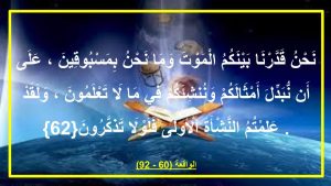 فالله في هذه الآية يخاطب كل من كتب عليه الموت ، وعلى رأسهم الإنسان ، فيقول لهم أنه سبحانه قد كتب علينا الموت ، وهو أعلم بما يشغلنا عند الموت ، وهما شيئان لا ثالث لهما ، الأول من سيحل محلنا في دنيانا وأهلينا وما سوف نتركه خلفنا ، فيرد الله علينا في ذلك بقوله ، { وما نحن بمسبقوين ، على أن نبدل أمثالكم} ، فسيأتي الله بمن يحل محلنا ، لأننا في ملكه وهو شأنه وحده ، وليس لنا من الأمر شيئا ، ثم ثاني وأهم ما يشغلنا ، وهو إلى أين بعد الموت ، فيرد الله علينا بقوله { وننشئكم فيما لا تعلمون} ، فهي نشأة جديدة أخرى ، لم يشأ الله أن نعلم عنها شيئا ونحن أحياء ، رحمة وعدل من الله ، ويستطرد سبحانه في الرد على تساؤلات النفوس ، عن طبيعة النشأة الجديدة ، بقوله تعالى .. { ولقد علمتم النشأة الأولى فلولا تذكرون } ، فوصف سبحانه النشأة الجديدة بأنها مثل النشأة التي نغادرها ، ونحن جميعا نعلم طبيعتها ، وذلك لو تذكرنا ما نراه كل يوم من حمل وولادة لطفل جديد ، وهل معنى ذلك أننا سنعود في نشأة أخرى ، فيرد الله علينا في سورة النجم .. {وَأَنَّ عَلَيْهِ النَّشْأَةَ الْأُخْرَى }النجم47 ، ولو تخلينا أنها نشأة يوم القيامة ، فسوف نكتشف أن الله حسم ذلك بقوله في العنكبوت .. {قُلْ سِيرُوا فِي الْأَرْضِ فَانظُرُوا كَيْفَ بَدَأَ الْخَلْقَ ثُمَّ اللَّهُ يُنشِئُ النَّشْأَةَ الْآخِرَةَ إِنَّ اللَّهَ عَلَى كُلِّ شَيْءٍ قَدِيرٌ }العنكبوت20 ، فالنشأة الآخرة شيئا مختلفا عن نشأة الدنيا المتكررة .