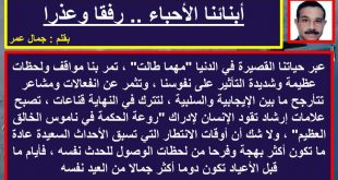 عبر حياتنا القصيرة في الدنيا "مهما طالت" ، تمر بنا مواقف ولحظات عظيمة وشديدة التأثير على نفوسنا ، وتثمر عن انفعالات ومشاعر تتأرجح ما بين الإيجابية والسلبية كالفرح والحزن والرضا والغضب والاطمئنان والخوف لتترك في النهاية قناعات بعينها تصبح علامات إرشاد تقود الإنسان لإدراك "روعة الحكمة في ناموس الخالق العظيم" …